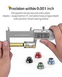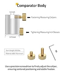 【Easy to Distinguish】 : The inserts and bottleneck cases have clear coding,and the hard anodised surface is ceramic-like, enhancing durability. lt comeswith a tin box for easy storage. 【Durable & Precision-Engineered】Crafted from anodized aluminum, the comparator kit ensures stability and accuracy for component alignment tasks. Secure the comparator body, insert the size-specific adapter, and zero in for precise measurements of component dimensions or fitment. 【Headspace Gauge Kit】:Precise for .17"–.45" components & E420 clearances. 14 inserts eliminate guesswork, enabling accurate seating depth & gap measurements for mechanical work, DIY, or craftsmanship. 【Innovative Dual-Screw Design】The dual-screw design of the comparator body ensures a secure connection to calipers, enabling one-handed precise measurements without extra help. Color-coded inserts with hard-anodized finish boost durability and quick identification. 【Wide Application】Included in the kit: comparator body, 14 size inserts Allen wrench, and setscrew. Suitable for hobbyists, craftsmen, and professionals, it comes with a detailed user manual for easy operation.