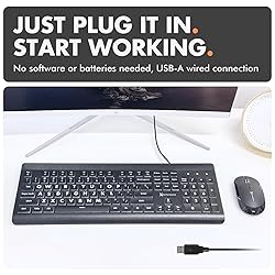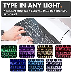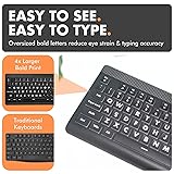 - Make typing easier and more comfortable with this large print keyboard featuring oversized bold letters that improve visibility and confidence with every keystroke. Designed as a big usb keyboard for seniors, students, and beginners, it’s also a reliable kids computer keyboard or teclado para laptop. Work clearly in any environment with the illuminated backlit keyboard wired that offers 7 backlight colors, 4 brightness levels, and memory settings that keep your preferred keyboard lights ready to go. Whether you need a light keyboard for dim rooms, a lightup keyboard for night use, or a keyboard with backlight for daily office work, this design keeps keys visible at all times. Stay productive with a full-size 107-key layout that includes a number pad and 12 shortcut keys for instant access to media and tools. Built as a dependable corded keyboard and wired keyboard for PC, it provides instant plug-and-play reliability with its integrated keyboard USB connection, no software or setup required. Crafted for long-term durability, this computer key board is an excellent choice as a large keyboard or giant keyboard for home, office, or shared spaces. Compatible as a Windows keyboard, teclado para PC, or backlit wired keyboard, it’s a dependable typing solution that blends visibility, comfort, and style. Connection Type: USB-A wired Number of Keys: 107 Switch Type: Domed membrane Backlight Colors: 7 Brightness Levels: 4 (Off, Dim, Bright, Brightest) Shortcut Keys: 12 (F1–F12) with Fn access Lighting Memory: Yes LED Indicators: Num Lock, Caps Lock, Fn Lock (Green) Compatibility: Windows PC, Chromebook Dimensions: 17.31 x 6.15 x 1.02 inches Cable Type: Integrated USB-A cable System Requirements: USB-A port on compatible device