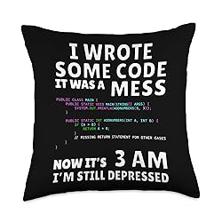 For Coders, IT, Compute Tech, Programming Nerds and Geeks who loves humor. This "I wrote some code, It was a mess, Now it’s 3 AM, I'm still depressed" poem is perfect for you. Show your humor with this poetry literature design. Ideal for Coders, Software Developers who loves humor. This Literary inspired design featuring a funny poem is perfect ideal for you. Showcase your passion in programming with this Funny Coding Software Dev Humor & Programmer Poems. 100% spun-polyester fabric Double-sided print Filled with 100% polyester and sewn closed Individually cut and sewn by hand Spot clean/dry clean only