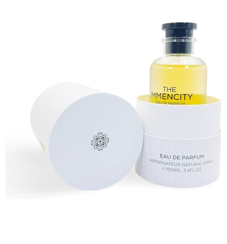 Introducing The Immencity Eau de Parfum, an exquisite fragrance that comes in a sleek 100ml/3.4fl.oz bottle. This sophisticated scent is presented in an elegant glass flacon with a distinctive black cap, containing a captivating golden-hued perfume. The packaging features a refined white cylindrical box adorned with a subtle chevron pattern and bold yellow accent panel. This natural spray fragrance offers a luxurious way to express your personal style. The contemporary design and premium presentation make it an ideal choice for those seeking a distinguished signature scent or a thoughtful gift option. The substantial size ensures long-lasting use, while the spray applicator allows for precise and convenient application.