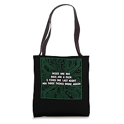 For Coders, IT, Computer Tech, Programming Nerds and Geeks who loves humor. This "Roses are red, bugs are a pain, I fixed one last night, Now three things broke again" poem is perfect for you. Show your humor with this poetry literature design. Ideal for Coders, Software Developers who loves humor. This Literary inspired design featuring a funny poem is perfect ideal for you. Showcase your passion in programming with this Funny Coding Software Dev Humor & Programmer Poems. 16” x 16” bag with two 14” long and 1” wide black cotton webbing strap handles. Made of a lightweight, spun polyester canvas-like fabric. All seams and stress points are double-stitched for durability, and the reinforced bottom flattens to fit more items and hold larger objects. Spot clean/dry clean only.