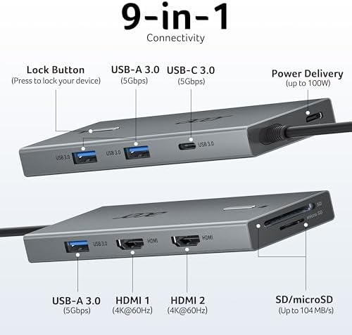 - 【9-in-1 USB-C Docking Station】This Acer laptop docking station includes 2 HDMI(4K@60Hz), 3 USB-A (5Gbps), 1 USB-C (5Gbps), 100W PD charging, and SD/MicroSD slots (104Mbps). 📌Note: 𝐏lease ensure your laptop has a 𝐔𝐒𝐁-𝐂 port with video output (𝐃isplay𝐏ort 𝐀lt 𝐌ode) support.