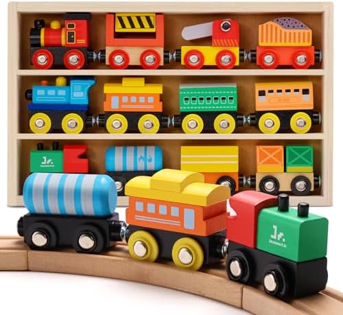 SainSmart Jr. Wooden Train Set 12 PCS - Train Toys with Storage Box, Magnetic Toy Trains Compatible with All Major Brands, Gift for Toddlers, Boys and Girls Aged 3+