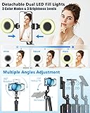 Complete Vlogging Kit: Designed for content creators, this kit includes a face-tracking tripod for iPhone, professional microphone, and dual LED lights. It helps with smooth, hands-free recording, clear audio, and professional lighting for high-quality content creation. Ideal for vlogging, live streaming, and social media videos 360° Face Tracking &Gesture Control: This AI-powered tripod for iPhone automatically centers your face in the frame, tracking your movements in real time. Perfect for vlogs, live streams, or memories, the phone tripod lets you start tracking with an "OK" gesture and stop with a "Palm" gesture, offering intuitive hands-free recording and ease of use Wireless Clip-on Microphone: This YouTube starter kit comes with two mics and a receiver, ensuring clear audio for vlogs and interviews. With a 2-hour charge, it delivers 12 hours of battery life. The receiver supports Type-C for iPhone 15+ and Android, and Lightning for iPhone 14 and earlier. Clip it on or hold it, recording wirelessly up to 79ft, perfect for TikTokers and content creators Adjustable Fill Light&Versatile Remote Control: Choose from Natural, Soft, or Warm lighting for the optimal brightness. More than a shutter, it works as a scrolling remote control for TikTok, page turner for iPad, and sends likes with a double press. Features fast Type-C charging, a 33ft range, and conveniently slots into the selfie stick for easy storage Flexible Angles&Enhanced Stability: The phone holder fits 4-4.7” devices, rotates 360°, and tilts 270° for ideal shots. Built from aluminum, it extends to 63 inches with a secure four-leg base. Content creator kit includes: selfie stick tripod*1, Led fill light*2, Remote control*1, Microphone Transmitter*1, Microphone receiver*2, Type-C charging cable*2, Storage bag*2, User manual*2