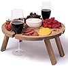 Portable Wine Picnic Table with 4 Wine Glasses Holder, Acacia Natural Wood Foldable Champagne Picnic Snack Table Tray, Perfect for Beach, Camping, Park, Concerts - Ideal Wine Gift for Men & Women