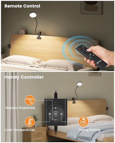 - Considerate Bed Lamp with Remote: This premium reading light clip for bed features 2.36-inch clamp and anti-slip padding to securely attach to headboards, desks, or dorm beds without damage. With dual control options—use the remote or the backlit inline switch—you can adjust the light without even getting up, whether you're in bed, at your workbench, or relaxing on the couch. Plus, the 30-minute auto-off feature means you can read until you drift off to sleep, a perfect reading light for bed