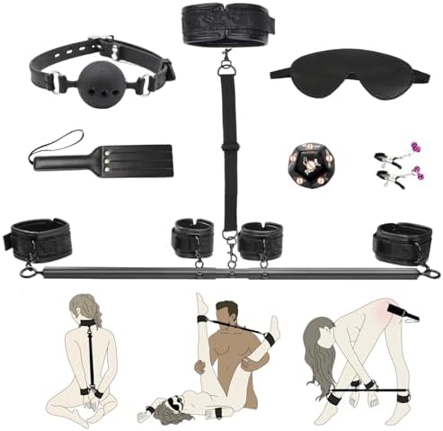 Spreader Bar BDSM Bondage Restraints Kit 11PCS Sex Toys Handcuffs Ankle Collar Cuffs Nipple Clamps Ball Gag Blindfold Paddle Dice PU Leather Lace Pattern Adjustable Adult Games for Couples