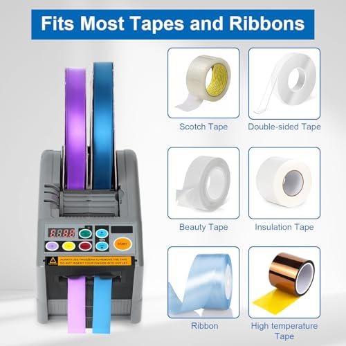 - DUAL TAPE CUTTING CAPABILITY: Cut two different tapes simultaneously with precision! This automatic ribbon cutter supports tapes ranging from 6mm to 60mm in width and 5mm to 999mm in length, making it ideal for a variety of applications, from packaging to crafting.