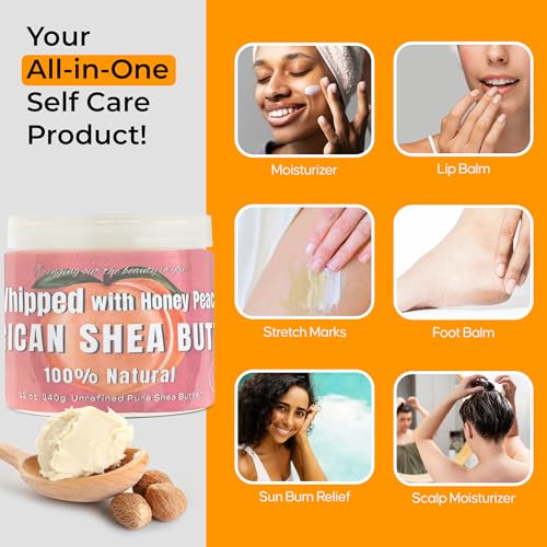 - PREMIUM WHIPPED SHEA BUTTER: Experience the silky-smooth texture of RA Cosmetics 100% African Shea Butter, handcrafted in Ghana. Infused with a sweet Honey Peach scent, this whipped formula deeply moisturizes and nourishes, leaving skin soft, supple, and hair beautifully conditioned.