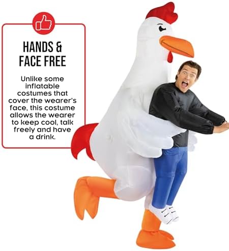 Bring the laughs wherever you go in this hilarious inflatable chicken costume—perfect for Halloween, office parties, themed events, or anytime you feel like shaking your tail feathers! It inflates in just 60 seconds with the built-in fan (4xAA batteries required, not included) and stays puffed for up to 4 hours of clucking-good fun. Designed to fit most adults comfortably, this blow-up costume features elasticated seals to keep the air in, a handy internal pocket for your phone or treats, and slips easily over your regular clothes. Whether indoors or out, this costume is lightweight, comfy, and guaranteed to steal the show. The perfect pick for adults who aren’t afraid of a little clucking chaos!