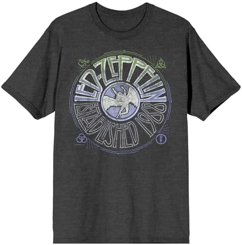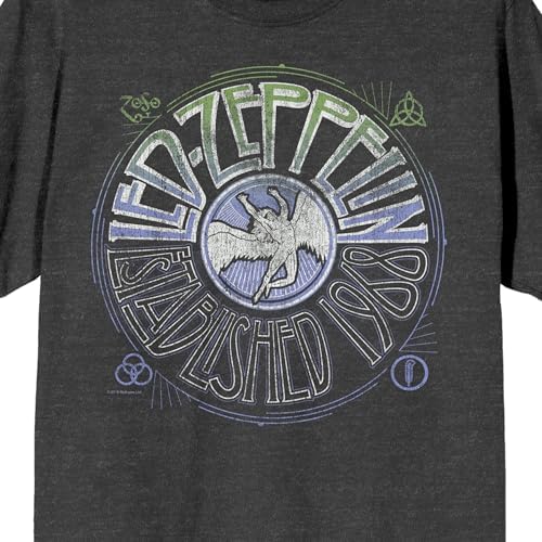 Celebrate the legacy of Led Zeppelin with this adult crew neck short sleeve t-shirt. Featuring the iconic Falling Icarus symbol surrounded by a circle of text reading "Led Zeppelin Established 1968," and four distinctive symbols placed around the text, this shirt showcases timeless rock style. Made from soft and durable cotton-polyester blend, it offers comfort and long-lasting wear. For simple maintenance, machine wash it on cold with like colors and tumble dry on low heat.