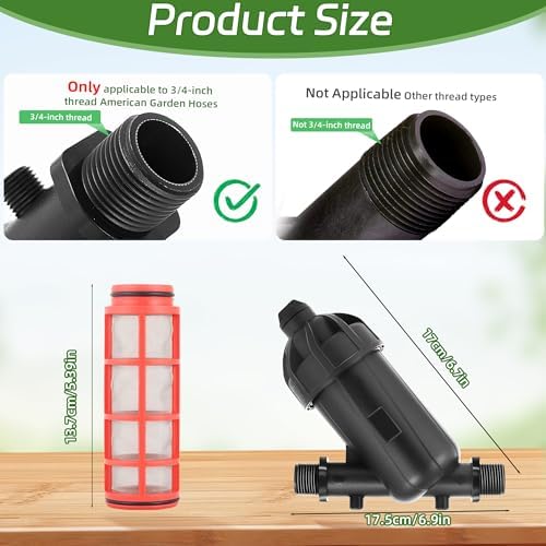 - 【 US standards Thread】: Custom dimensions for 3/4 inch threaded connections to US standards,3/4" GHT garden hose thread connections,Customized dimensions will not occur the situation of water leakage and interface type mismatches. Our in line drip irrigation filter for drip irrigation system are micron-precise, high efficient and large volume filtration capable, meeting diverse requirements on size, flow rate and filtration precision.