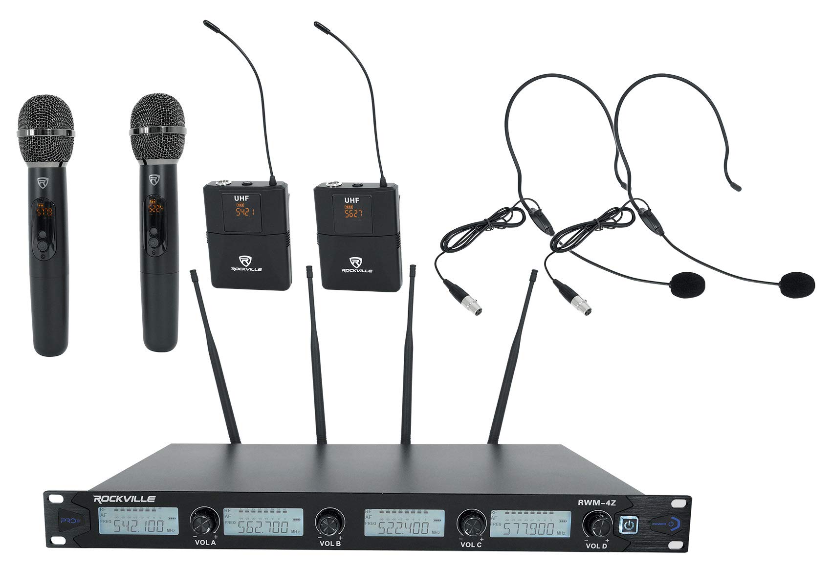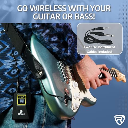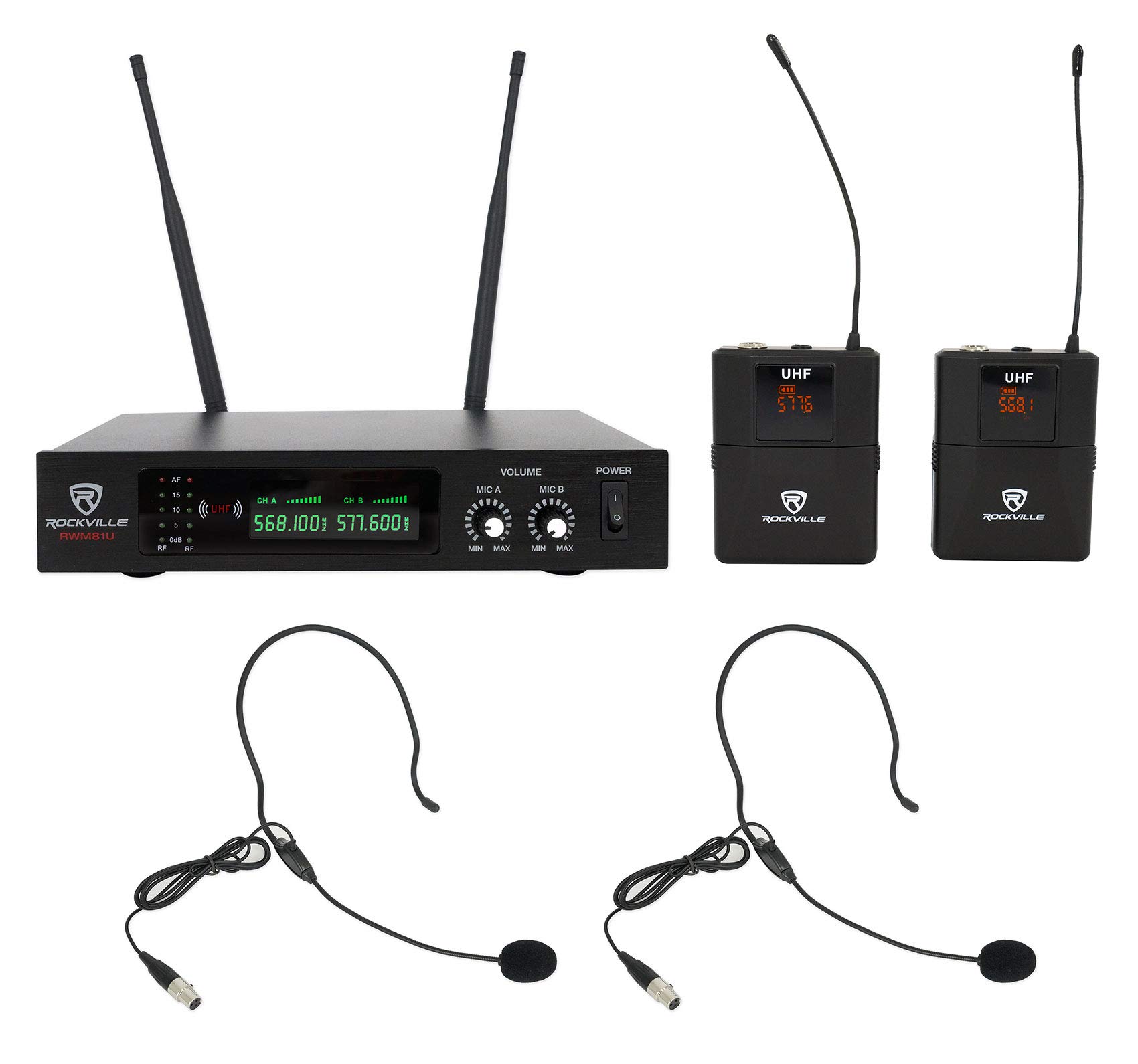 Rockville RWM-DSP-L2 Dual UHF Wireless Microphone System, DSP Control, EQ, Echo, Feedback Filter, Channel Scan, Includes Lapel & Headset Mics, Guitar Cables, Perfect for Presentations & Performances