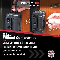 A𝗱𝗷𝘂𝘀𝘁a𝗯𝗹𝗲 T𝗲𝗻𝘀𝗶𝗼𝗻 S𝗽𝗿𝗶𝗻𝗴𝘀: Our patented tension adjustment system allows you to customize the closing speed using the included Allen-key. Precisely align the self-closing hinges and latch posts for smooth gate operation and secure latching. P𝗼𝗼𝗹 & C𝗵𝗶𝗹𝗱 Sa𝗳𝗲𝘁𝘆: Safetech self-closing fence gate hinges are designed to ensure gates are never accidentally left open, making them ideal for swimming pools, childcare centers, schools, playgrounds, and homes. F𝗲𝗻𝗰𝗲/ Ga𝘁𝗲 T𝘆𝗽𝗲: Our heavy-duty gate hinge is made for use on aluminum gates weighing up to 145 pounds max load per pair and swing close efficiency at 90 pounds and usable with an 8/10” gate frame to fence post gap. 𝙣𝙤𝙩 𝙨𝙪𝙞𝙩𝙖𝙗𝙡𝙚 𝙛𝙤𝙧 𝙘𝙝𝙖𝙞𝙣 𝙡𝙞𝙣𝙠 𝙛𝙚𝙣𝙘𝙚. Ea𝘀𝘆 I𝗻𝘀𝘁a𝗹𝗹a𝘁𝗶𝗼𝗻: Our SHG-90L Topklik kit includes two hinges, Allen-key, installation guide, and fasteners. Review our installation video for more information. H𝗲a𝘃𝘆 D𝘂𝘁𝘆 P𝗼𝗹𝘆𝗺𝗲𝗿: Our polymer hinges will not rust, bind, sag or stain. Along with its self-lubricating feature, our hinges require no maintenance throughout their life and apply lubrication on every use. Ga𝘁𝗲 & F𝗲𝗻𝗰𝗲 Ha𝗿𝗱𝘄a𝗿𝗲 S𝗼𝗹𝘂𝘁𝗶𝗼𝗻𝘀: Safetech Hardware is a global leader in innovative, patented gate and fence hardware, specializing in high-quality, secure, and reliable products like pool gate latches, lockable gravity latches, and self-closing hinges. Designed for ease of use and installation, our solutions empower manufacturers and installers worldwide with cutting-edge hardware.