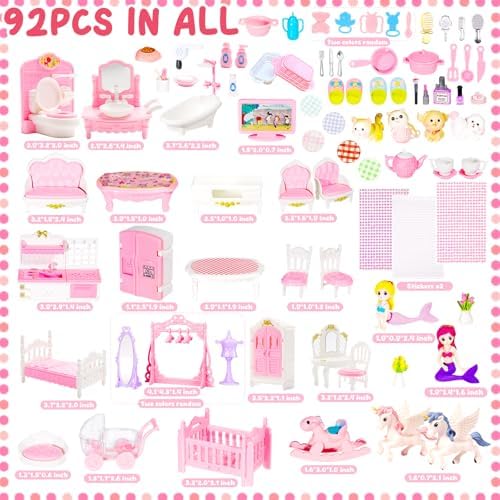 92 Pcs Miniature Furniture Set Accessories 1:12 Scale Mini Furniture Plastic Bedroom Living Room Bathroom Kitchen Kit Small Pink House for Birthday Gift