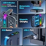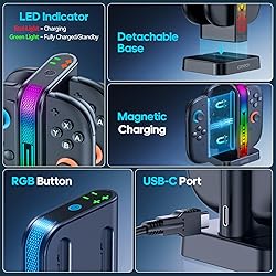 FRIENDLY REMINDER: Only compatible with Nintendo Switch 2nd-gen Joycons. NOT for 1st-gen Nintendo Switch/OLED Version, NES controllers or other 3rd-party switch controllers. [MAGNETIC JOY-CON 2 CHARGER] This Nintendo Switch 2 controller charger features magnetic charging technology, allowing for easy attachment and hassle-free charging. The charging ports are clearly marked with indicators: connect the L-Joycon to the "-" port and the R-Joycon to the "+" port. The dual-color LED light clearly shows the charging status: green means fully charged or no load, while red indicates charging in progress. [PERFECT GAMER GIFT SOLUTION] This Joycon 2 charger features a futuristic LED design with customizable breathing light effects, creating a high-tech vibe. Perfect for daily use or as a stylish decor piece, Nintendo Switch 2 charging dock showcases unique taste. An eye-catching and thoughtful gift for gamers, Joy Con 2 charging dock station effortlessly brightens up their gaming life. [LONG-PRESS TO TURN OFF THE LIGHT] This Switch 2 controller charger offers two lighting modes for versatile fun. First, the breathing cycle mode with fast/slow pulse options creates different moods. Second, the solid-color mode provides seven choices (red, orange, yellow, green, cyan, blue, purple) to suit various tastes. Switching modes is effortless - just tap the touch button on top. To turn off lights, simply long-press the button. [COVER DIVERSE CHARGING NEEDS] This Switch 2 Joycon charger supports multiple power supply methods to adapt to various usage scenarios. Whether you're connecting it to a 2nd-gen Nintendo Switch dock for charging while gaming, using a HUB to power multiple devices simultaneously, plugging it into a wall outlet for fast charging, or relying on a computer's USB port for emergency power top-ups, charger for Nintendo Switch 2 effortlessly meets diverse charging needs, freeing you from environmental limitations. [GAME ITEMS FOR TRAVEL OR BUSINESS TRIPS] This Switch 2 charger features a built-in IC chip preventing overcharging and short circuits to fully protect your Joycon 2. With four anti-slip pads on the bottom for a secure grip, switch 2 remote charger prevents accidental knocks by pets. Its compact, detachable design makes storage easy and space-saving. You can charge your controllers anywhere, whether on a business trip or traveling. It’s a perfect charging accessory for gamers on the move.