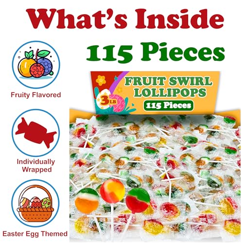 - EASTER ASSORTED LOLLIPOPS: Enjoy a mix of strawberry, cherry, and orange swirled lollipops, each packed with bold, fruity flavor. These classic lollipops are a delicious Easter treat for kids and adults alike!