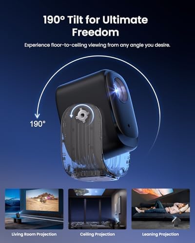 - 190° Tilt Freedom, Zero Clutter: This mini projector features a built-in gimbal stand that offers 190° tilt, allowing you to project from floor to ceiling with ease. Its integrated power board eliminates the bulky adapter, simplifying your setup with a single power cable for a clutter-free experience. Plus, the power port at the gimbal’s base ensures unrestricted tilting, providing smooth adjustments without cable interference.