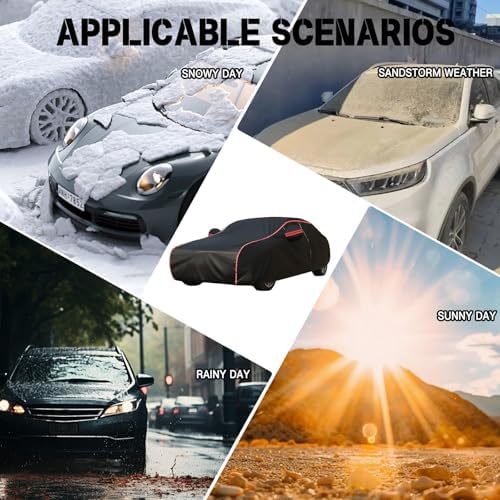 - WATERPROOF CAR COVER: The car covers waterproof is made of 190T polyester taffeta, waterproof and breathable, light and soft, wear-resistant and easy to clean. Rainproof and sunproof in summer, snowproof and warm in winter