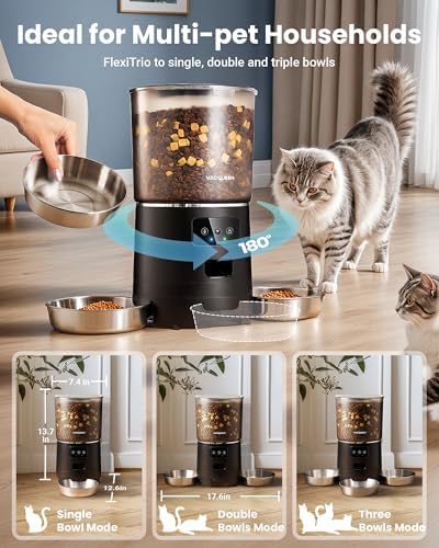 - 3-Bowl Split Automatic Feeder System: This innovative cat feeder automatic design lets you choose between 3, 2 or 1 bowls, perfect for multi-pet homes. Adjust the portions per meal (1-20 servings) according to your own needs.