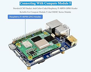 - Features 1. This is Mini Base Board (A) with standard CM5 socket and color-coded RPi 40PIN GPIO header, compatible with Compute Module 5 Lite/eMMC Series. Suitable for evaluating the Raspberry Pi CM5 or being integrated into end products 2. Onboard multiple connectors, more convenient to use. Onboard muitiple interface, including 16PIN PCIe/ MIPI/HDMI/USB 3.2/USB 2.0 FFC/ RJ45 Gigabit Ethernet Interface, etc. 3. GPIO Header and PCIe Connector: Equipped with Color-Coded 40PIN GPIO header, for connecting various HAT / HAT+ modules. And it equips with 16PIN PCIe (PCIe Gen2/3 x1) for connecting various PCIe expansion boards 4. 4K Video Output and Dual HDMI Port: One is HDMI0 port, supports 4K output. The other is HDMI1 FFC connector, supports 4K output too, which can be connected through an adapter 5. Rich USB Interfaces: Onboard with Dual USB 3.2 Gen1 high-speed ports, supports 5Gbps synchronous operation. And onboard with USB 2.0 ports via a 6-pin FFC connector 6. Dual MIPI Interfaces and Fan Header: Onboard with Dual MIPI interfaces for connecting DSI displays and CSI cameras 7. Fan Header and Power Input: 5V, 4PIN JST-SH PWM connector. Power Input is DC 5V 5A Comes with Online Development Resources /User Manual, please follow there: bit.ly/43btnqj Package Content CM5-IO-BASE-A x1 Screws pack x1