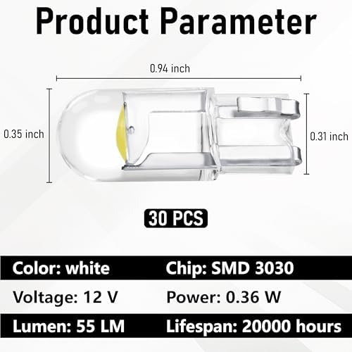 - Widely Used: Measuring 0.94 inches in length, 0.35 inches in bulb diameter, and with a mounting portion of approximately 0.31 inches, this 194 bulb is suitable for a wide range of 12V vehicles. It can be widely used for license plate light, dome light, map light, turn signal light, parking light, grocery box light, reading light, door light, and more