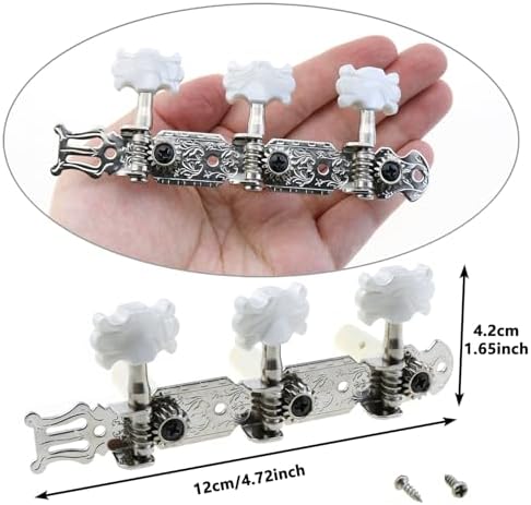 Providing a precise tuning experience for your classical and acoustic folk guitars, this guitar tuning peg is the ideal choice! Made from high quality materials, it not only looks stylish, but also offers excellent durability and practicality, which can significantly improve the performance and intonation of your guitar. Made of steel plate with a nickel plated finish and vintage pattern engraving, this guitar tuning peg is both beautiful and artistic. The gears are made of copper with a 1:14 gear ratio, ensuring a smooth and precise tuning process. The steel body is rugged, rust and corrosion resistant, with an easy to cut iron string post to make your tuning experience easier. The knob handles are made of imitation marble pearl patterned plastic for an elegant and stylish look and comfortable feel. The open knob design makes tuning faster, accurate and not easy to run out of tune, suitable for daily practice and performance use. The product is divided into two specifications, left (3L) and right (3R), which is convenient for you to quickly replace the old or damaged tuning pegs. Product features: Accurate tuning: 1:14 gear ratio, fast and accurate tuning, stable intonation without running. Stylish appearance: Nickel plated surface with vintage pattern, imitation marble pearl knob, elegant and beautiful. Durable material: steel body is rust resistant and corrosion resistant, copper gears are smooth and durable. Easy installation: Includes left and right tuning pegs and mounting screws, easy to replace. Widely applicable: Suitable for classical guitar and acoustic folk guitar. Product specification: Material: steel plate, plastic Colour: silver Gear ratio: 1:14 Size: 120x40mm/4.72x1.57 inches (LxH) Package content: 1 right guitar machine head 1 left guitar machine head mounting screws