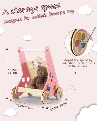 Wooden Baby Walker with Wheels, Baby Push Walkers for Girls 6-12 Months, Push Toys 1 Year Old Girl Small Size