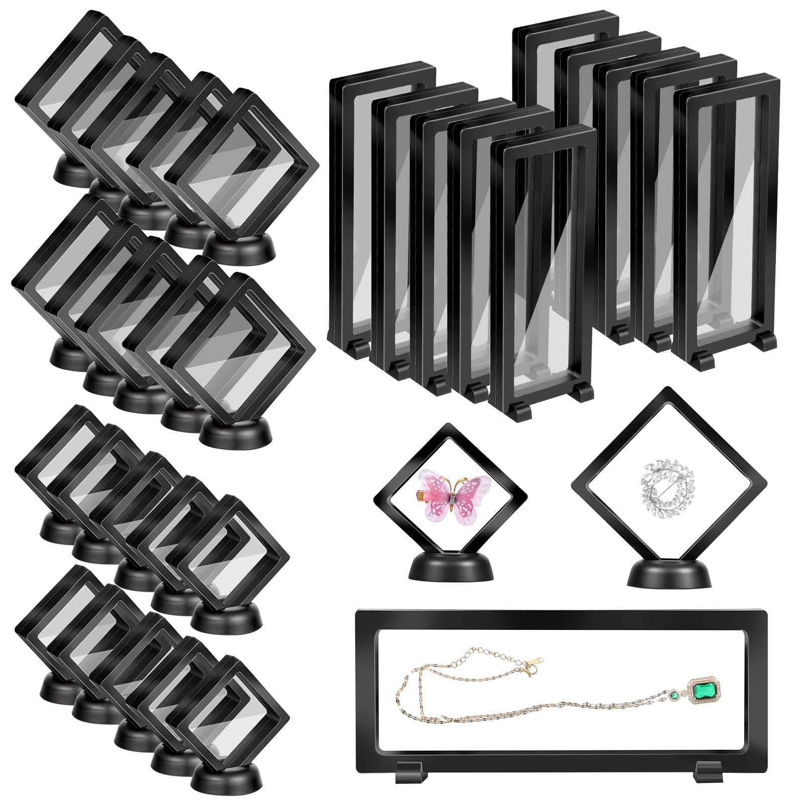 30Pcs Floating Display Case, 3D Floating Frame Display Case with Stand - Clear PE Film for Jewelry, Coins, Fossils (2.7 x 2.7 x 0.8 Inches, Black)