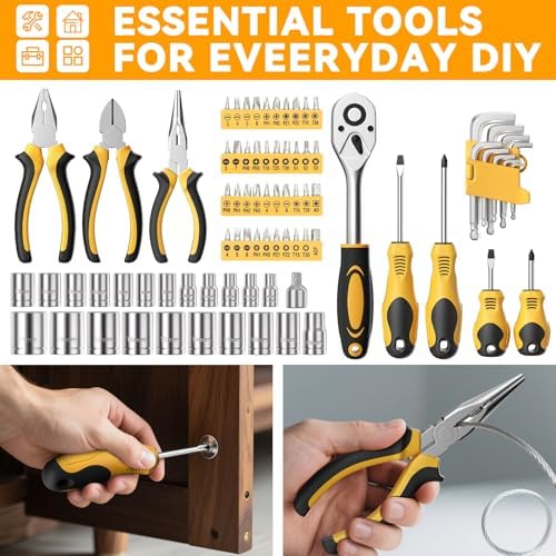 Home Tool Kit 199 Piece Basic Household Auto Repair Tool Set Car Toolbox General Hand Tool Kit for Home Men Women DIY with Plastic Toolbox Storage Case Pliers Wrench Combination
