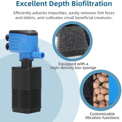 - 【Excellent Depth Biofiltration】: DaToo submersible aquarium filter with Depth Filtration Technology is equipped with a high-density bio-sponge that can efficiently adsorb impurities, easily remove fish feces and debris, cultivate beneficial small creatures, and help keep the aquarium water clear and transparent. You can add ceramic balls, filter cotton, activated carbon and other filtration materials according to your needs to further enhance the filtration effect .