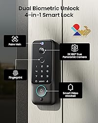 [Next-Gen Smart Lock for Front Door] Upgrade your home security with a true all-in-one smart lock. Enjoy keyless entry with fast palm vein or fingerprint unlock—no fumbling for keys, no delays, just instant access. [2K Ultra-Wide Camera & Video Doorbell] Experience a full 180° 2K panoramic view that shows every detail from head to toe—covering 75% more area than most video doorbells on the market. Smart motion alerts, IR night vision, and two-way talk keep you connected and in control, day or night. With 8GB local storage, your moments stay safe—no subscription needed. [Dual Biometric Unlock + 6 Access Methods] Unlock your door via palm vein, fingerprint, PIN code, app, voice assistant (Alexa/Google/Apple/Samsung), or mechanical keys. Perfect for multi-generational families, guests, and Airbnb hosts. [Privacy-First Security] All facial, biometric, and video data is processed locally on the device with triple-layer encryption—keeping your information safe from hacking and unauthorized access. [Quick Setup & Worry-Free Support] Install in 15 minutes with just a screwdriver. Backed by 12-month warranty, 24/7 customer service, and lifetime technical support for complete peace of mind. What's in the Box: Exterior Assembly ×1, Interior Assembly ×1, Rechargeable Lithium-ion Battery ×1, Rear Mounting Plate ×1, Deadbolt Lock Body ×1, Strike Box ×1, Rear Mounting Plate Screws ×2, Quick Start Guide ×1.