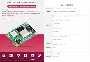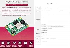 - Features ● Upgraded processor BCM2712, quad-core Cortex-A76 64-bit SoC, more powerful performance. ● More options for RAM (2GB / 4GB / 8GB / 16GB). ● More options for eMMC Flash (0GB (Lite) / 8GB / 16GB / 32GB / 64GB). ● Faster eMMC Flash storage, up to 200 Mbps data rate. ● Optional for certified radio module, supports either PCB trace antenna or external antenna, more suitable for industrial applications. ● Adopts B to B connectors, most compatible with Compute Module 4. ● Onboard Gigabit Ethernet PHY supporting IEEE1588, suitable for network applications. ● Onboard PCIe Gen 2 x1 interface, allows connecting more useful modules. Specifications Processor: Broadcom BCM2712 quad-core Cortex-A76 (ARM v8) 64-bit SoC @ 2.4GHz Memory: 2GB, 4GB, 8GB or 16GB LPDDR4-4267 SDRAM (depending on variant) Storage: 0GB (Lite), 8GB, 16GB, 32GB or 64GB eMMC Flash (depending on variant), up to 200 Mbps data rate Connectivity: ① Optional wireless LAN, 2.4GHz and 5.0GHz IEEE 802.11b/g/n/ac wireless, Bluetooth 5.0, BLE, with onboard and external antenna options ② Onboard Gigabit Ethernet PHY supporting IEEE1588 ③ 1 × USB 2.0 interface ④ 2 × USB 3.2 Gen1 interface ⑤ 1 × PCIe Gen 2 x1 interface 28 GPIO signals ⑥ SD card interface for SD card (for use only with Compute Module 5 variants without eMMC) Video: ① 2 × HDMI interface (up to 4Kp60 supported) ② 2 × 4-lane MIPI interface Multimedia: ① 4Kp60 HEVC decoder ② OpenGL ES 3.1 graphics, Vulkan 1.3 Input Power: 5V DC RTC: Built-in Real-time clock (RTC), powered from external battery Operating Voltage: -20°C ~ 85°C ambient Dimensions: 55 × 40 × 4.7mm Package Content 1. Compute Module 5 (CM5102032) x1