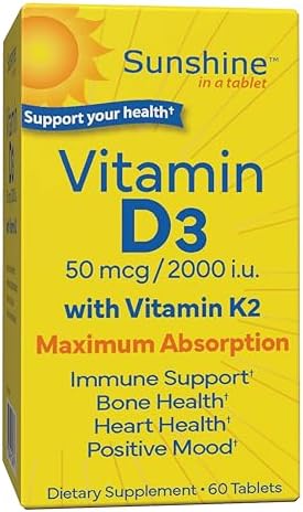 Sunshine Vitamin D3 with Vitamin K2, D3 2000 IU with K2 100 mcg for Healthy Muscle Function, Bone Health and Immune Support, Vitamin D3 K2, 60 Tablets