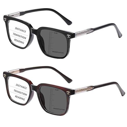 [Crisp Vision & Effortless Transitions]: 3-in-1 Multifocal Lenses designed for prolonged exposure to computer monitors or screens, desks, or other spaces approximately 3 ft apart, providing excellent visual clarity and comfort while working, reading, writing or communicating. Enjoy clear vision readers and blue light glasses combo for all-day comfort and superb convenience [Comfort Built to Last]: Experience pressure-less wear with lightweight and durable TR frames, built to withstand daily drops and impacts. Stiff metal spring hinges offer effortless opening/closing, ensuring a superior fit, and integrated nose pads lock securely to prevent sliding, eliminating pressure on your nose and ears during extended wear [Advanced High Transmittance and Blue Anti-Light Technology]: FSA and HSA Approved, and is clearer and more durable than other lenses; Optimal-quality anti-fatigue lenses use high light transmission technology and anti-blue light coating [Classic Striped Square Frames]: Elevate your professional presence with these fashion square eyeglasses, where dark brown and navy blue stripes flow in aerodynamic contours along the frame. Features L-shaped gold metal embellishments for luxury texture. From business meetings to digital workspaces, these square chunky frame deliver timeless elegance that commands attention [2 Pack for Great Value]: You'll get 2 Pack Progressive Multifocus Reading Glasses to store in your house and office, 2 Eyeglasses Protective Bag, 1 Microfiber Cleaning Cloth, 1 Eyeglasses Strap. Everything you need to maintain clarity, comfort, and organization—To prevent scratches and ensure longevity, we recommend storing your glasses in the included genuine leather bag when not in use