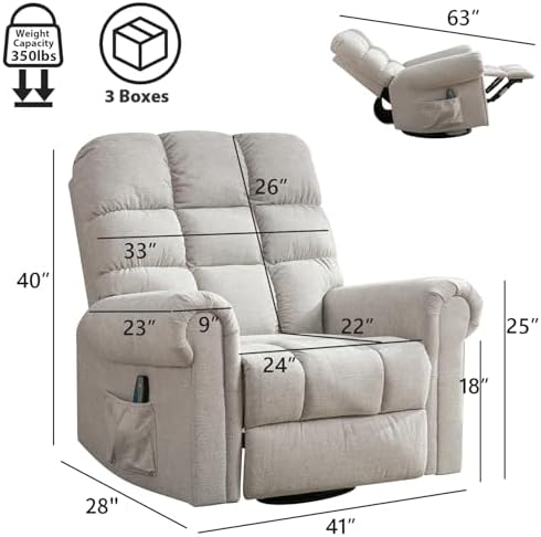 Oversized Massage Recliner Chairs with Massage and Heat, 360° Swivel Rocker Recliner, Breathable Fabric Overstuffed Reclining Sofa for Living Room Bedroom (1, Cream White)