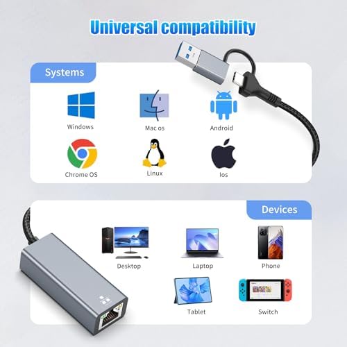 - ⚡ Dual USB 3.0 & USB-C Gigabit Speeds Achieve 1000Mbps wired stability with this USB to Ethernet adapter (compatible with USB-C/USB 3.0). Perfect for lag-free gaming, 4K streaming, or Zoom calls—eliminate WiFi drops during critical moments!