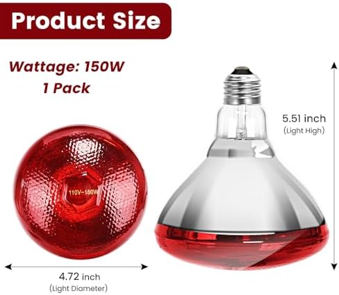 The Best Red Heat Lamp Bulbs For Chicken For Your NeedsSpecification:Voltage: 110V-120VLight Source Wattage: 150watts Bulb Base: E26Light Type: IncandescentLight Diameter: 4.72 inchLight High:5.51inchAverage Life: 5000hScope Of Application: Animal Husbandry, Chicks, Dogs, Poultry, Reptile, Farm, Physiotherapy, Bathroom, Food Warming, Etc.Features:- 150W Powerful And Efficient Heating- Warm And Comfortable Light- Safe , Durable And Long-lasting- Wide Range Of ApplicationsNotice:1. Always use a high quality E26 lamp holder and avoid turning the bulb off repeatedly as this will prolong the life of the bulb.2. Please keep a proper distance, especially from pets or food, to minimize non-existence or safety hazards that may result from overheating.3. Do not use when the voltage is unstable. Do not use with dimmers, thermostats and varistors.4.Do not splash water on the heat bulb when in use.Why Do I Select DaToo Red Heat Lamp Bulbs for Chicken?1.Powerful And Efficient Heating: The interior is covered with a thickened aluminum-plated film that concentrates more light and heat, instantly heats up and is energy efficient, ensuring that chickens can quickly embrace warmth even in cold weather!2.Warm And Comfortable Light: The lampshade is made of linen surface process, the light is more even and soft, which can provide heat without stimulating the animal's vision, effectively promote metabolism and increase the survival rate. Especially at night, there is little interference with your pet's circadian rhythm.3.Safe: Made of high-density, high-hardness thickened borosilicate glass, all the glass has been rigorously tested, waterproof and explosion-proof, even if it is used for a long time, it can always be safe and stable.4.Durable: High quality double spiral tungsten filament, high temperature resistance, oxidation resistance, high heating efficiency.5.Long Life: E26 copper nickel-plated lamp head, high conductivity, corrosion and burn resistance, service life up to 5000 hours.6.Wide Range Of Applications: Suitable for a wide range of poultry, pets and small mammals, reptiles and amphibians, it also excels in promoting plant growth, catering and family health.7. Excellent After-sales Service: If you have any questions or needs, please contact customer service, we will reply and help you within 24 hours.Select DaToo Products= Own A Private Aquarium HousekeeperJUST DO IT, Let’t Go!!