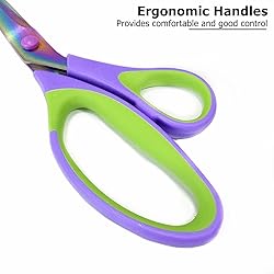 - Elevate your crafting experience with this Craft Scissors Set of 3 Pack, featuring All-Purpose Sharp Titanium Blades Shears designed for precision and durability. The set includes three versatile sizes: a 5.5-inch embroidery scissor for intricate detailing, an 8.5-inch craft scissor for everyday projects, and a 10-inch fabric scissor for heavy-duty cutting. Each pair boasts titanium-coated blades that stay razor-sharp, resist rust, and glide effortlessly through materials like fabric, paper, cardboard, and DIY supplies. The ergonomic comfort-grip handles reduce hand fatigue, making them ideal for extended use in sewing, office tasks, school projects, or home crafts. With a sleek purple design, these multipurpose shears combine functionality and performance, perfect for adults seeking reliable toolset for creative, professional, or educational needs.