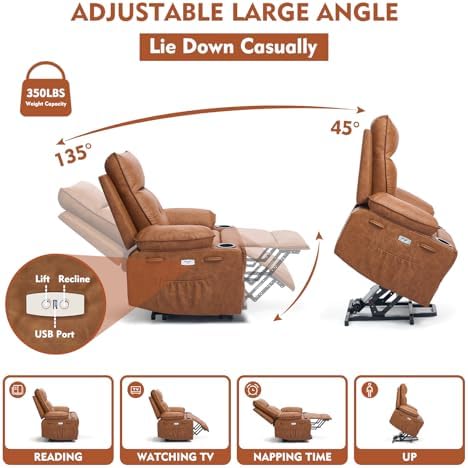 • 【High Quality Fabrics and Soft Cushions】Our elderly lift chairs and lounge chairs are made of leather. It not only soft and wear-resistant but also easy to clean.It is not only soft and wear-resistant but also resistant to pilling and fading. The headrest, backrest, seat cushion, and armrests are all filled with high-density sponge, providing you with ultimate comfort and support.The chair is durable and fully functional. It is an ideal choice for reading or relaxing