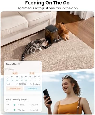 - Remote Care for Your Cats: Remote Care for Your Cats: Connect via 2.4GHz WiFi to Remotely Schedule Up to 10 Daily Meals (1–12 Portions Each). Effortlessly manage your pet’s diet through the dedicated iOS/Android app "oneisall" anytime, anywhere. Real-time meal data tracking helps scientifically prevent overfeeding, fostering a regular and healthy eating routine for your pet.