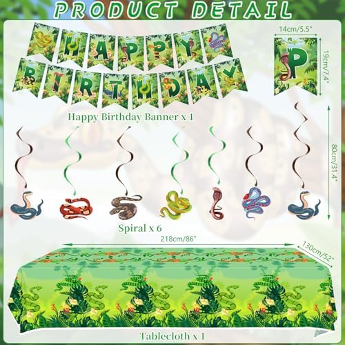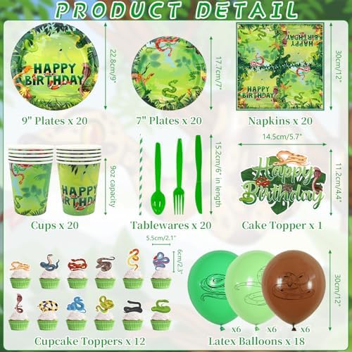 - Snake Birthday Party Supplies: you will get 1 Happy Birthday Banner, 6 Spirals, 12 cake toppers, 1 big cake decoration, 18 pattern balloons, 20 large plates, 20 small plates, 20 paper cups, 20 paper towels, 20 straws, 1 tablecloth, 20 knives, forks, and spoons