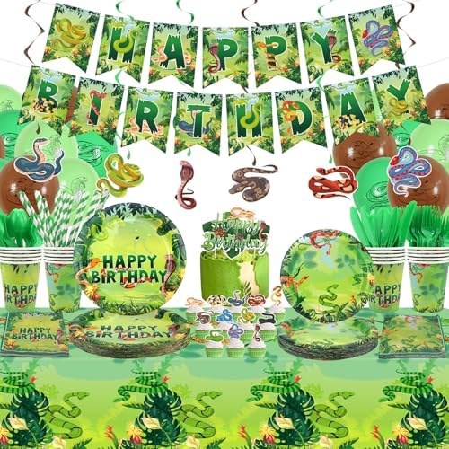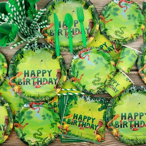 KEFAN Snake Birthday Party Decorations, Snake Theme Party Tableware Supplies including HAPPY BIRTHDAY Banner, Plates, Cups, Napkins, Tablecloth, Balloons for Snake Birthday Party, Serves 20 (L)