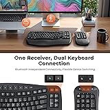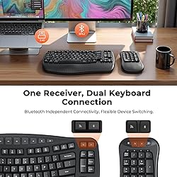 【FLEXIBLE COMBO】The 2-in-1 ergonomic wave keyboard features a split design. The keyboard and the numeric keypad can be freely combined to support flexible layouts for both left and right hands. Left-handed users can put the numeric keypad on the left to match their habits. When space is tight, store the numeric keypad and use only the main keyboard to save space. 【ERGONOMIC COMFORT DESIGN】K9330 keyboard is ergonomically designed, with soft curves and a wavy layout that follows the natural movements of fingers as they stretch and bend. The separate numeric keypad can be placed to the right of the right hand, keeping the main keyboard centered. This suits the ergonomic needs of accountants working long hours and reduces arm movement. 【MULTIPLE CONNECTIONS】The keyboard and the numeric keypad share a 2.4G orange USB receiver. And both of them have their own independent Bluetooth channels. You can use the USB receiver to easily connect the keyboard and the numeric keypad for synchronous operation, or use the Bluetooth function to pair them with different devices respectively, freely switching usage scenarios. 【ERGO WRIST REST】Compared with a standard keyboard without a wrist rest, the integrated curved wrist rest can provide more support for the wrist, reducing wrist flexion and thus prolonging typing comfort. There are adjustable tilt feet at both the front and back of the bottom of the keyboard, which can position the ergonomic keyboard at the optimum angle. 【PERSONALIZE YOUR SETUP】The separate numeric keypad offers enhanced flexibility in configuring your workspace. It serves as a powerful tool that significantly boosts your work productivity, allowing you to tailor your setup to meet diverse needs and achieve peak efficiency. 【DUAL SYSTEM COMPATIBILITY】The K9330 keyboard is compatible with both Windows and macOS systems, allowing users to switch between platforms with ease. With 9 individual shortcut keys on the keyboard, you can streamline your workflow and take your efficiency to new heights. Whether you're crunching numbers, editing text, or working with multimedia, this keyboard has you covered. 【POWER-EFFICIENT DESIGN】For optimal energy savings, K9330 keyboard features a smart hibernation design. After 20 minutes of inactivity, it will enter sleep mode, reducing unnecessary power consumption. The power switch is conveniently located on the right side for your control, enabling you to turn off the power when not in use. Both the main keyboard and the numeric keypad require 2 AAA batteries each, which are not included.