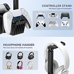 All-in-One Desktop Organizer - Our 5-in-1 desktop storage stand can simultaneously store headphones, two controllers, cell phones, remotes, pens, scissors, and other items, which comprehensively improves space utilization and keep your gear and space organized. Sturdy Dual Controller Holders - Specifically designed for gamers, the dual handle stand design holds your grips securely in place to reduce slipping or accidental damage. There are also designed with 4 little pen holders, no more lose your pen again. It is ensures that the items are kept within easy reach for quick and easy access. Convenient Headphone Stand - This earphone hook is compatible with most headphones, rotates 360°, and features soft rubberized pads to prevent your precious headphones from falling or scratching. Two cable organizers to keep your headset cables neat and organized, creating a clean and tidy desktop. It can also be given as a gift to your friends and family. Multi-function Desk Storage Box - Two storage boxes, perfect for storing remote controls, pens, USB cables, scissors your daily essentials, easy to access and reduce the hassle of searching. The front practical phone holder allows you to play or work without missing any important information. Every detail is designed to facilitate your efficient life. Durable and Easy Installation - Our desktop headset holder is made of high quality and durable ABS plastic, allowing you to use it for a long and durable time! Simple black fashionable appearance, enhance work efficiency and desktop aesthetics. Quickly installed in a few minutes, the installation process is simple and easy to remove. NOTE: The new items may have some resistance to the buckle, please try to install it with force.