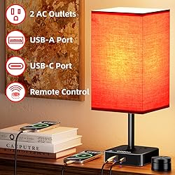 Upgraded Multifunctional Bedside lamp: Built-in 2 USB charging port and 2 AC outlets,High-end fabric lampshade and 9W LED dimmable remote-control bulb included; Table lamp with 9W dimmer remote control led bulb that can be remotely controlled within 33ft.With the remote control, you can easily control the brightness modes, no need leaving warm bed or sofa. Dual Control Method: With the remote control and touch switch, controlling the lamp is made convenient and effortless. The remote control allows you to turn on/off or adjust the settings without leaving your bed, saving you time and effort. The remote control needs to be powered on for the first time. (Tear off the battery protective insulation sheet) Stepless Brightness Optional : Use the remote control (rotate) to adjust the brightness by stepless from 5% to 100%, and Use the remote control (press) to adjust the brightness by 3 way dimmable control. Of course, you can also use the touch panel on the lamp base to control brightness and switches.Create soft ligth, no disturb your partner, no longer trip in the dark.Replaceable bulb design, which means you can choose different lights to match different scene you need. 2 USB Charging Ports 2 AC outlets:This USB table lamp providing convenient charging for your mobile devices,AC outlets allowing you to charge or power other devices, such as clock, speaker,mobile phones, tablets, laptops, and other electronic devices. No more searching for outlets or dealing with tangled charging cables.The USB port and outlet functions regardless of whether the lamp is on or off. It will look beautiful in any contemporary home or office. Modern Home Decor: This end table lamp features a clean and simple design that complements any decor, making it a perfect addition to your bedroom, living room, office, or any other space.Great for daily lamp lighting or as a decoration in your home. Perfect choice for a gift for your family, and friends.