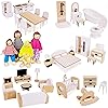 Wooden Dollhouse Furniture Set, 36 Pcs Wood and Plastic Doll House Accessories and Furniture Set with 4 Family Dolls 5 Rooms, Pretend Play Miniature Toys for 3+ Kids Birthday