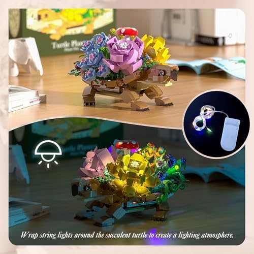 Flowers Turtle Pot Building Toys with Succulent and LED Lights, Botanicals Sea Turtle Planters Set, Compatible with Lego Flowers Collection, for 8+ Girls, Adults, Women, Decoration