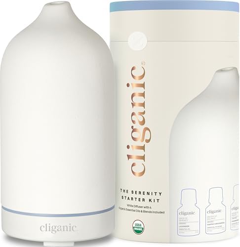 Cliganic Serenity Essential Oils Starter Kit with Diffuser Set for Aromatherapy, Home & Office (White)