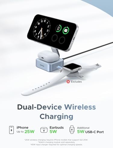 - Dual-Device Convenience: Charge your iPhone and AirPods wirelessly at the same time, plus an extra 5W USB-C port for more devices, ideal for desk or nightstand use